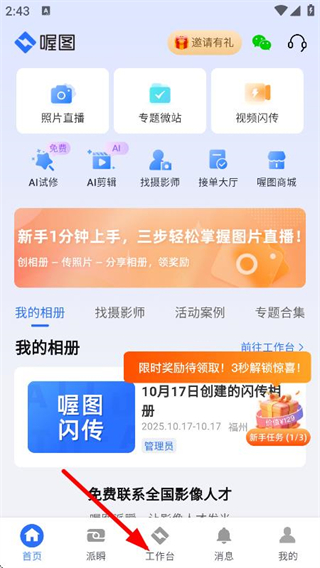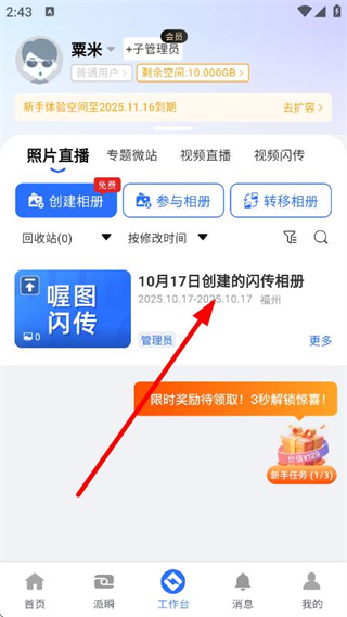 2、在工作臺頁面,點擊10月17日創(chuàng)建的閃傳相冊,進(jìn)入相冊管理頁面。