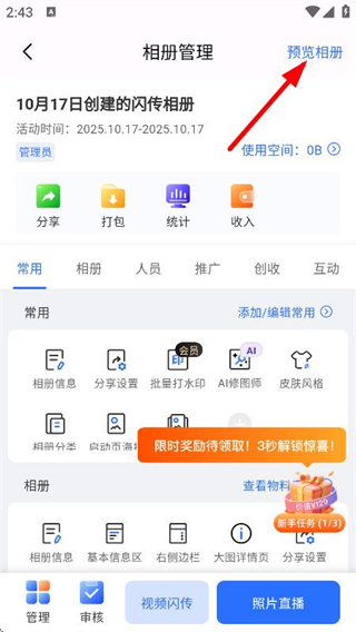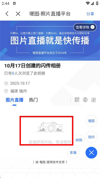 4、在相冊預(yù)覽頁面,可查看10月17日創(chuàng)建的閃傳相冊相關(guān)信息及直播準(zhǔn)備情況。