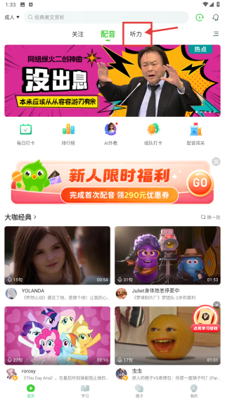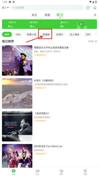 1、打開英語學(xué)習(xí)類應(yīng)用,點(diǎn)擊頂部聽力分類,進(jìn)入聽力資源頁面。