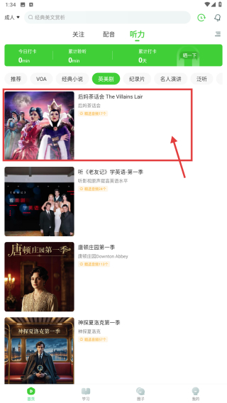 2、在聽力資源頁面,選擇英美劇板塊,瀏覽英美劇類聽力資源列表。