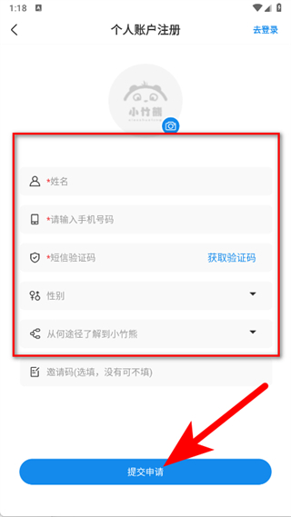 5、依次填寫姓名、手機(jī)號(hào)碼,點(diǎn)擊獲取驗(yàn)證碼并輸入收到的驗(yàn)證碼等信息,點(diǎn)擊提交申請(qǐng)按鈕,完成注冊(cè)流程。