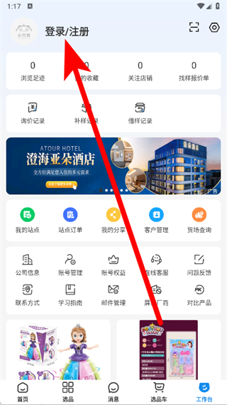 2、進(jìn)入工作臺(tái)頁(yè)面后,找到上方顯眼的登錄注冊(cè)按鈕,點(diǎn)擊該按鈕進(jìn)入登錄相關(guān)界面。