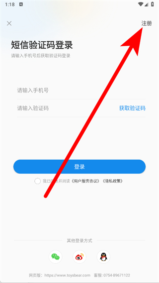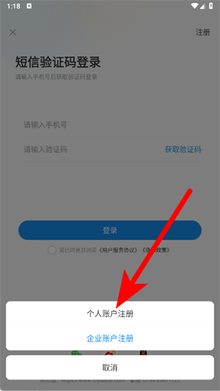 3、在短信驗(yàn)證碼登錄頁(yè)面,點(diǎn)擊右上角的注冊(cè)選項(xiàng),此時(shí)會(huì)彈出注冊(cè)類型選擇框。