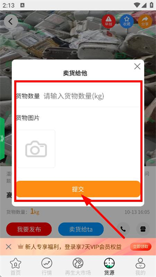 4、輸入貨物數(shù)量、添加貨物圖片后,點(diǎn)擊提交,完成賣貨操作。