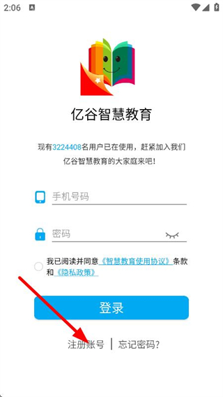 2、在億谷智慧教育登錄頁(yè)面,點(diǎn)擊注冊(cè)賬號(hào),進(jìn)入賬號(hào)注冊(cè)頁(yè)面。