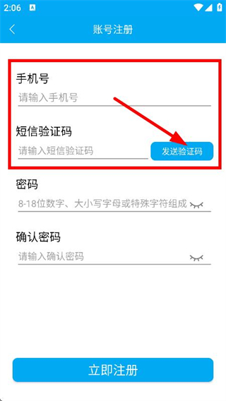 3、在賬號(hào)注冊(cè)頁(yè)面,輸入手機(jī)號(hào),點(diǎn)擊發(fā)送驗(yàn)證碼獲取驗(yàn)證碼并輸入。