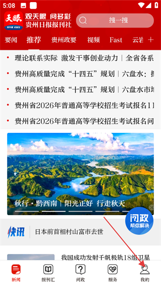1、進(jìn)入天眼新聞頁面,點(diǎn)擊底部我的,進(jìn)入個(gè)人頁面。