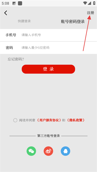 3、在登錄頁面,點(diǎn)擊右上角注冊(cè),進(jìn)入賬號(hào)注冊(cè)頁面。