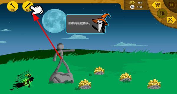 3、點擊棍棒的圖標,訓練火柴人棍棒手,棍棒手能在礦山區(qū)域起到防護等作用,保障開采安全。