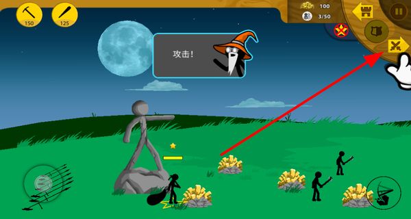 4、當有敵人來襲時,點擊攻擊按鈕,操控棍棒手進行自動攻擊,抵御敵人的進攻,保護礦工和開采的金礦。