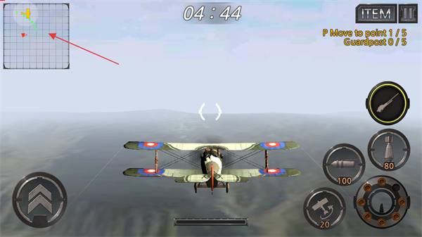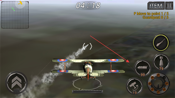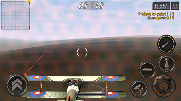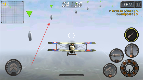 4、通過屏幕左下方虛擬搖桿控制飛機(jī)方向和飛行姿態(tài),持續(xù)完成任務(wù)目標(biāo)。