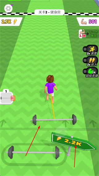 3、在健身房關(guān)卡,進(jìn)行舉重等健身操作,積累能量值,提升自身屬性,為場景探索奠定基礎(chǔ)。