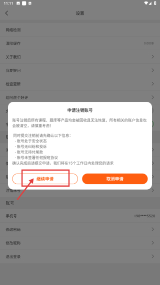 4、在注銷賬號確認彈窗中,點擊繼續(xù)申請按鈕,提交賬號注銷申請。