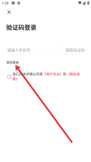 3、進(jìn)入驗(yàn)證碼登錄頁面后,點(diǎn)擊密碼登錄選項(xiàng),點(diǎn)擊切換到密碼登錄模式。