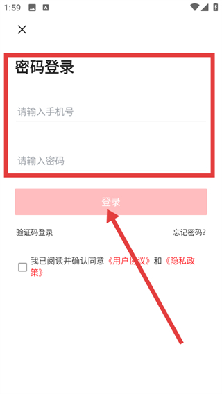 4、在密碼登錄頁面,輸入手機(jī)號(hào)和密碼,勾選同意后,點(diǎn)擊登錄按鈕,完成登錄。
