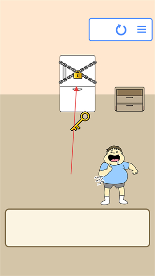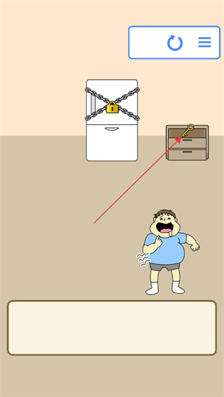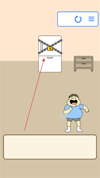 1、進(jìn)入關(guān)卡,看到被鎖鏈和鎖封住的冰箱,以及旁邊的柜子,明確目標(biāo)是幫人物吃到冰箱里的食物。