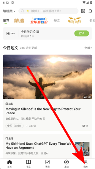 每日完成閱讀任務(wù)可打卡,累計(jì)打卡獲勛章激勵(lì),還能邀請(qǐng)好友組隊(duì)打卡,借助社交監(jiān)督減少半途而廢,幫助用戶養(yǎng)成持續(xù)閱讀的英語(yǔ)學(xué)習(xí)習(xí)慣。