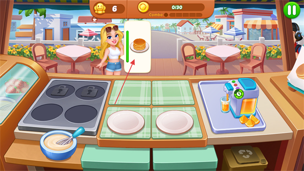1、進(jìn)入游戲,留意屏幕上方顧客需求提示,比如圖中顧客要煎餅,點(diǎn)擊灶臺開始制作煎餅。