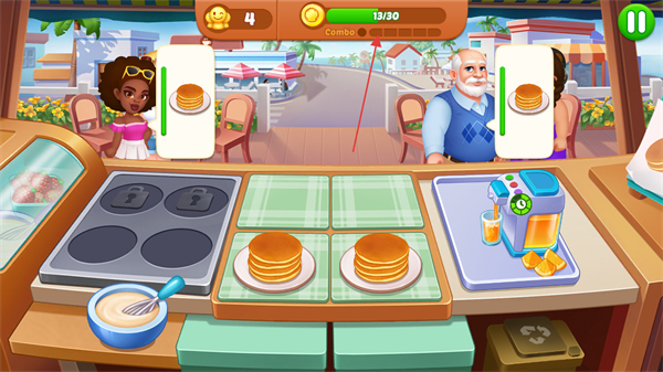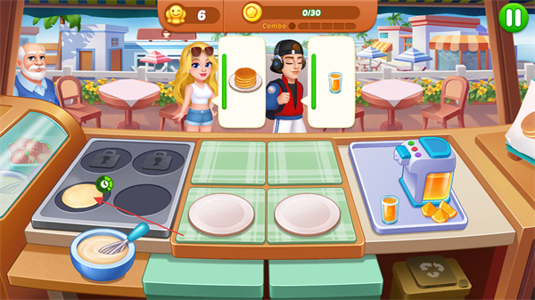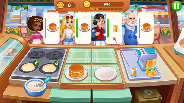 4、制作完成后,及時將食物遞給對應(yīng)顧客,獲取金幣,同時注意Combo連擊數(shù),提高收入。