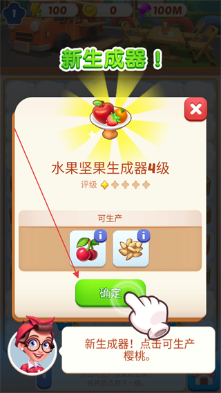 2、新生成器!是水果堅果生成器4級,可生產(chǎn)櫻桃、花生,點(diǎn)擊確定。