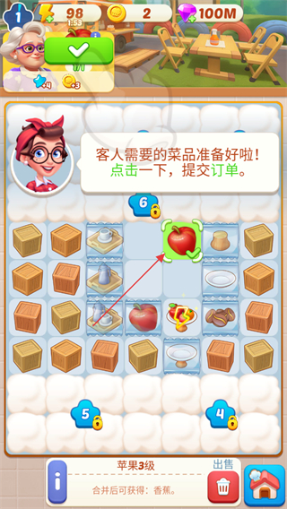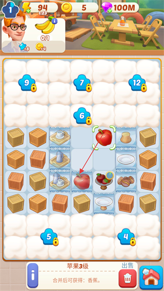 4、蘋果3級,合并后可獲得香蕉,按提示合并蘋果來獲取香蕉。