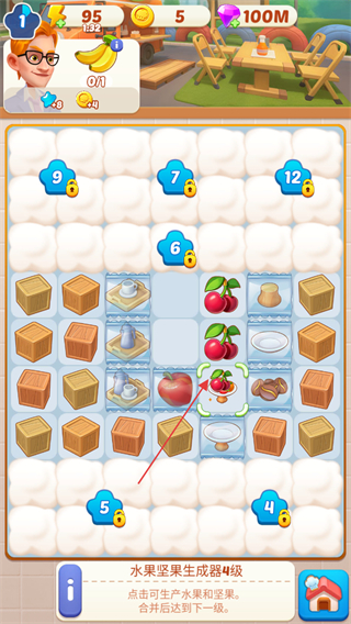 3、水果堅(jiān)果生成器4級,點(diǎn)擊可生產(chǎn)水果和堅(jiān)果,合并后還能升級。