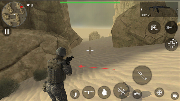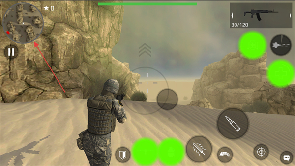 1、觀察左上角地圖,了解敵人位置,操控角色在沙漠地形中移動,尋找掩體。