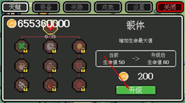2、點(diǎn)擊頭像,進(jìn)入天賦界面,消耗金幣點(diǎn)擊升級(jí)按鈕即可提升。