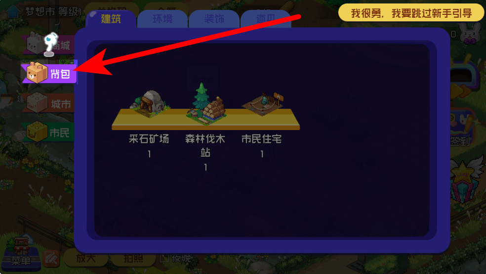 1、進(jìn)入游戲先創(chuàng)建市長(zhǎng)形象與城市名稱(chēng),跟隨新手引導(dǎo)了解基本操作,通過(guò)背包里的建筑道具,如采石礦場(chǎng)、森林伐木站、市民住宅等,點(diǎn)擊放置到合適區(qū)域完成建造。
