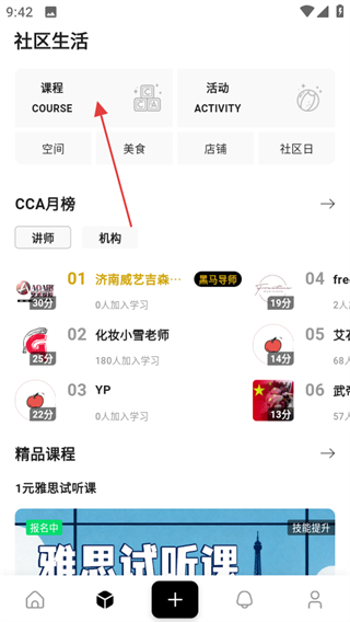 2、在社區(qū)生活頁面,點(diǎn)擊課程可進(jìn)入課程相關(guān)板塊。
