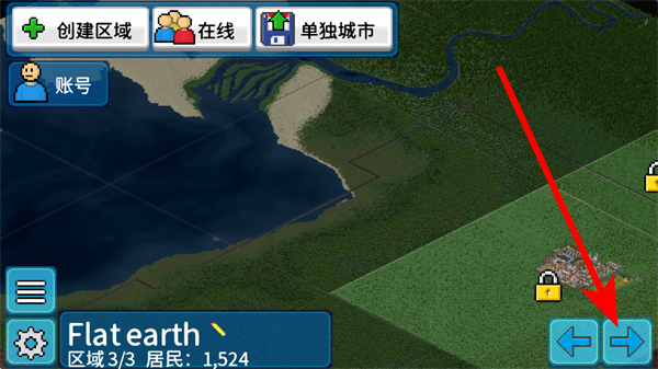 2、在區(qū)域切換界面,可通過(guò)左右箭頭切換不同區(qū)域,找到解鎖的區(qū)域后點(diǎn)擊進(jìn)入,即可開始城鎮(zhèn)建設(shè)。