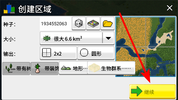 3、穿件區(qū)域時(shí)設(shè)置種子、區(qū)域大小、輸出形狀等參數(shù),還可選擇地形、生物群系等裝飾選項(xiàng),完成后點(diǎn)擊繼續(xù)。