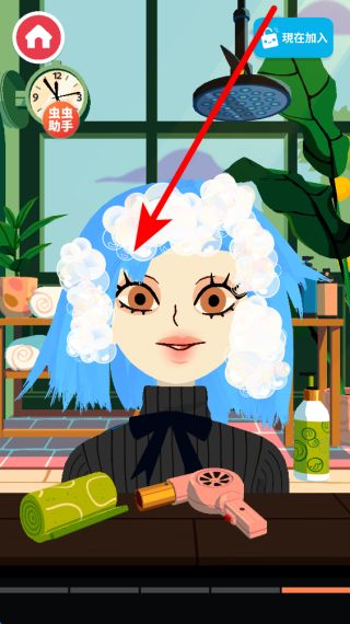 3、接著美發(fā)護理,來到美發(fā)護理環(huán)節(jié),可用泡沫為角色洗頭,之后用吹風機工具整理頭發(fā),讓頭發(fā)呈現(xiàn)整潔狀態(tài)。