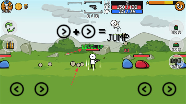 1、按兩次右箭頭按鍵觸發(fā)JUMP,收集金幣并觸發(fā)LEVEL UP提升等級(jí)。