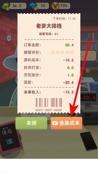 3、訂單完成后會(huì)生成賬單,顯示訂單金額、原料成本、顧客評(píng)價(jià)等,若出現(xiàn)退款可選擇觀看視頻免除成本,減少損失。