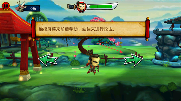 1、按照提示觸摸屏幕來前后移動,站住來進(jìn)行攻擊,操控角色移動并發(fā)起攻擊。