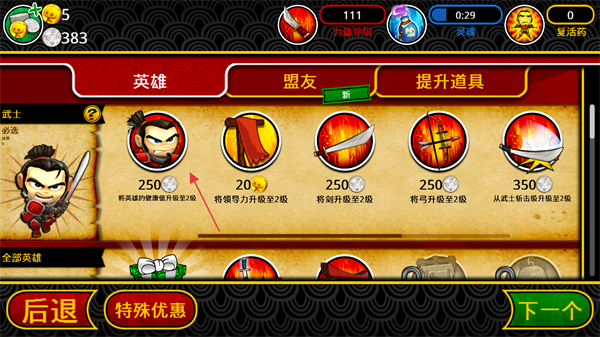2、消耗資源升級(jí)武士等英雄,提升戰(zhàn)斗能力。