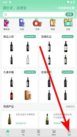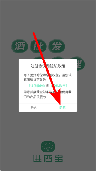 1、打開進(jìn)酒寶,在彈出的注冊協(xié)議和隱私政策窗口中,點(diǎn)擊同意。