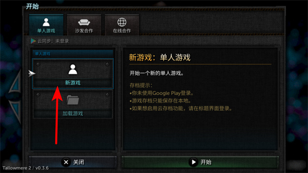 4、在游戲開始界面,選擇單人游戲模式下的新游戲,開啟單人冒險,新手可借此熟悉玩法,積累資源,逐步解鎖游戲內(nèi)容。