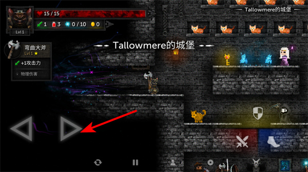 3、在Tallowmere的城堡地牢場景中,利用左右箭頭按鈕操控角色移動,穿梭于多層地牢間,探索寶箱、擊敗怪物,推進關(guān)卡進程。
