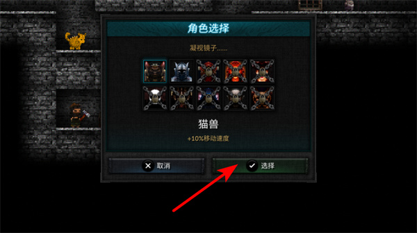 1、進入游戲后,在角色選擇界面,可選貓獸角色,其擁有+10%移動速度特性,點擊選擇按鈕確認,該角色移速優(yōu)勢利于地牢快速探索。