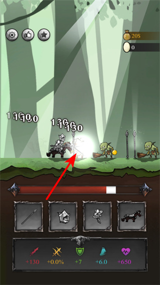 4、進入戰(zhàn)斗界面后,操控騎士與森林中的哥布林戰(zhàn)斗,關注戰(zhàn)斗過程中的傷害數(shù)值,勝利后可獲取金幣等資源。