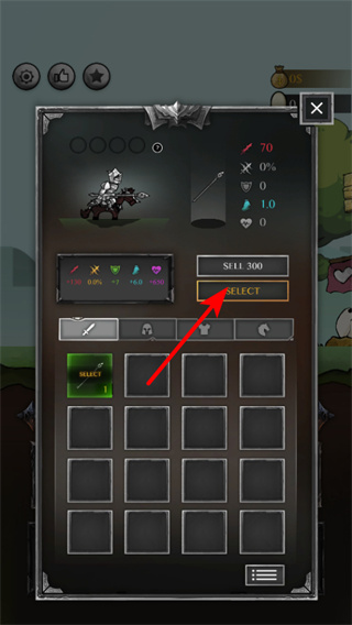 4、在裝備界面中,點擊SELECT按鈕選擇武器,可查看武器的攻擊力、暴擊率等屬性,合理搭配武器是提升騎士戰(zhàn)力操作。
