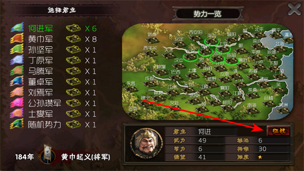 2、在勢(shì)力選擇界面,可優(yōu)先選擇何進(jìn)勢(shì)力,其初始占據(jù)洛陽且武將能力較強(qiáng),能助力前期快速發(fā)展。