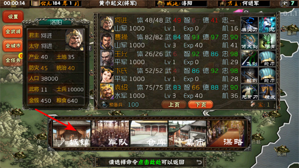 1、進(jìn)入游戲后,在難度與劇本選擇界面,建議選擇將軍難度和184年黃巾起義劇本,難度適中勢(shì)力清晰。
