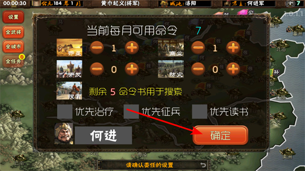 4、在指令確認(rèn)界面,關(guān)注每月可用命令數(shù),合理調(diào)整開發(fā)、商業(yè)等指令分配,點(diǎn)擊確定完成指令設(shè)置。