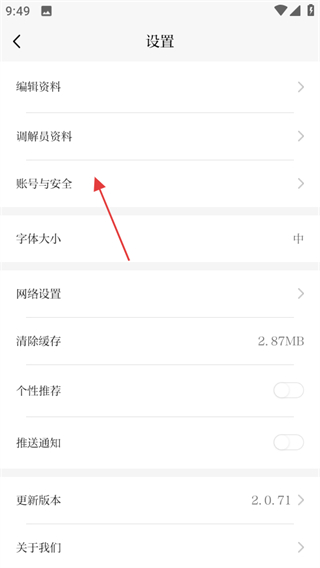 3、在設(shè)置頁面,點(diǎn)擊賬號(hào)與安全可進(jìn)入賬號(hào)安全相關(guān)頁面。