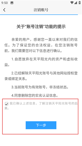 5、在注銷賬號(hào)提示頁面,勾選確認(rèn)信息后點(diǎn)擊下一步。