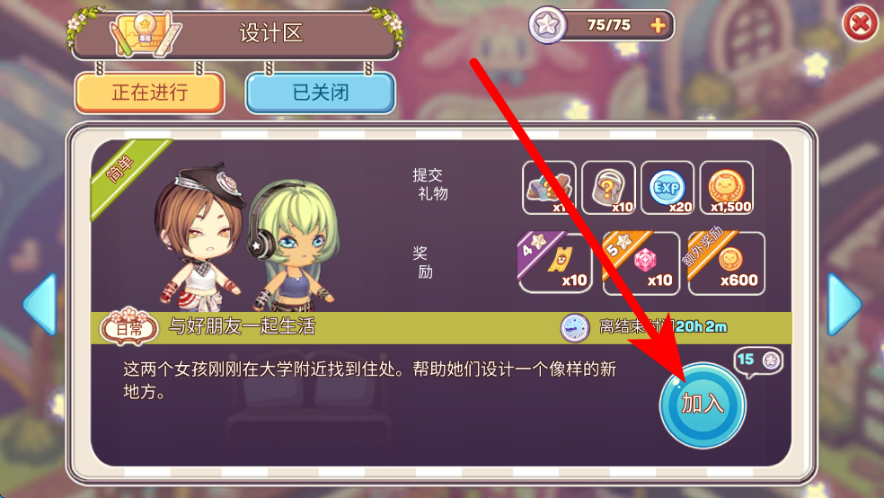 1、進(jìn)入設(shè)計區(qū),選擇正在進(jìn)行的任務(wù),點擊加入,根據(jù)客戶需求布置房屋,可獲得經(jīng)驗、金幣、星星等獎勵。