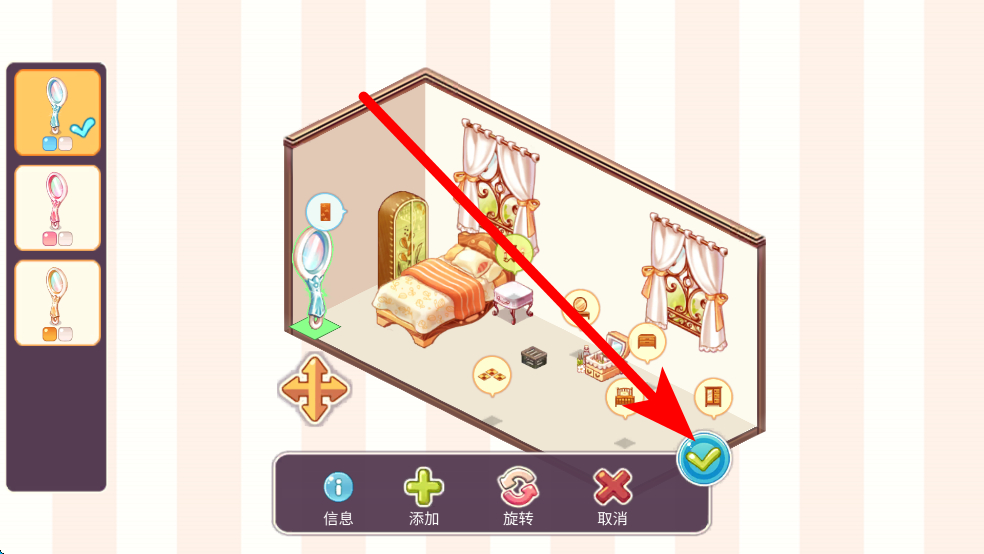 2、玩家可以通過拖拽擺放至合適位置,還可旋轉(zhuǎn)調(diào)整方向,完成后點擊對勾確認(rèn)布置。